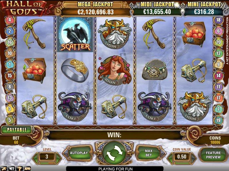 I spelet Hall of Gods är temat hämtat från den fornnordiska mytologin. Här kommer du att snurra bland de gamla och nordiska gudarna och vikingarna. Det absolut mest spännande med spelet är den progressiva jackpotten som hela tiden laddas på tills någon vinner hela summan. I spelet finns även chansen att vinna free spins.
